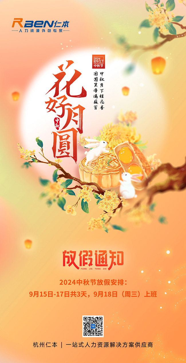放假時間:9月15日—9月17日,共3天。9月14日(星期六)正常上班。