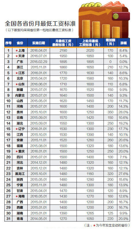 目前,全國最低工資標準整體的狀況是:上海最低工資標準每月2190元,為全國最高,比位居第二位的天津高出240元,比位列第三位的廣東省高出295元;青海的最低工資標準為1270元,為全國最低。