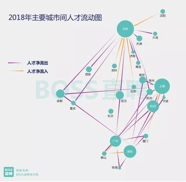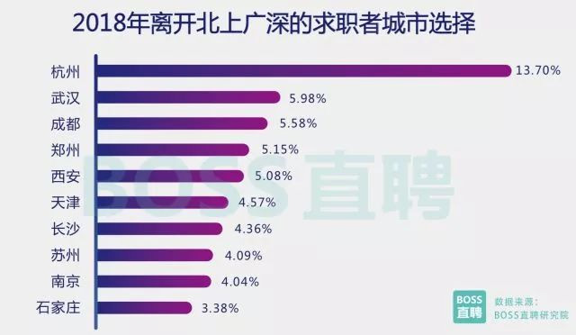 2 人才間的城市移動 新一線城市人才爭奪戰(zhàn)加劇 杭州武漢成都鄭州西安成第一集團(tuán) 2017年,隨著“新一線”城市人才吸引政策的集中出臺,城市間“搶人集團(tuán)”的排位雛形已經(jīng)顯現(xiàn)。 BOSS 直聘研究院數(shù)據(jù)顯示,2018年前兩個月,一線城市(北上廣深)人才繼續(xù)流出至二三線城市,凈流出率達(dá)到 0.6%,較2017年同期增加0.05個百分點(diǎn)。 相應(yīng)地,二線城市人才吸引力也繼續(xù)增強(qiáng),其中杭州、武漢、成都、鄭州、西安五個城市人才吸引力最高,2018年離開北上廣深的求職者,有35.5%的人選擇了這五所城市。而且,這一趨勢已經(jīng)在18個月左右的區(qū)間里相對穩(wěn)定,這五個城市成為“新一線”城市搶人的第一集團(tuán)。