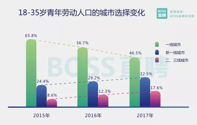 盡管二線城市人才數(shù)量快速上升,但在人才質(zhì)量方面,二線城市還和一線城市有明顯差距。 BOSS直聘數(shù)據(jù)顯示,2018年旺季,從事互聯(lián)網(wǎng)、金融、專業(yè)服務(wù)等高薪行業(yè)且學(xué)歷為碩士以上的人才,超過八成仍然選擇在 一線城市打拼。 僅46.5%的18-35歲青年勞動者首選一線城市 BOSS直聘研究院數(shù)據(jù)顯示,近三年來,工作首選城市為北上廣深的18-35歲青年勞動者比例迅速下降,從 2015年的65.8%下降至2017年末的46.5%。選擇新一線城市的青年勞動者比例直線上升,選擇二三線城市的年輕 人比例也較2015年翻倍。