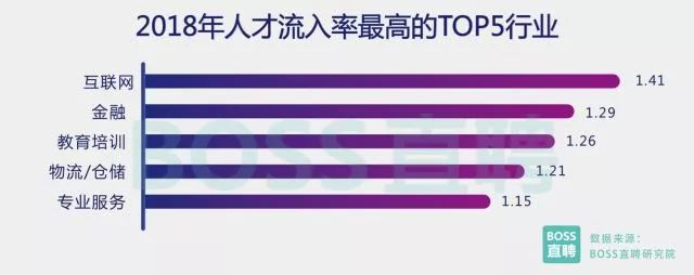 與薪資排名前十的行業(yè)相比,貿(mào)易、冶金、化工等傳統(tǒng)行業(yè)表現(xiàn)低迷,2018年平均招聘薪資普遍在6500元 以下,薪資增幅普遍低于1%,機(jī)械設(shè)備行業(yè)的平均薪酬還小幅下降了0.7%。 互聯(lián)網(wǎng)行業(yè)依然是最熱門領(lǐng)域 教育與物流行業(yè)異軍突起 根據(jù)BOSS直聘研究院的觀察,2018年求職旺季,人才流入率最高的五個行業(yè)中,互聯(lián)網(wǎng)和金融行業(yè)依然穩(wěn) 居前兩名。 有趣的是,教育培訓(xùn)和物流/倉儲行業(yè),分別得益于知識經(jīng)濟(jì)崛起及營商環(huán)境改善帶來的迅速發(fā)展, 人才吸引力大幅增強(qiáng)。2018年,這兩大領(lǐng)域人才凈流入比例甚至將過去深受求職者青睞的專業(yè)服務(wù)與通信行業(yè) 甩在身后。