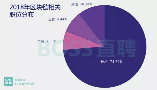 與海外相比,國內(nèi)區(qū)塊鏈人才供應(yīng)增長態(tài)勢較為穩(wěn)定。2018年前兩個月,人才供應(yīng)量同比增加235%,增速 雖高于其他互聯(lián)網(wǎng)職位,但存量仍遠(yuǎn)低于實(shí)際需求。 截至2018年2月,專業(yè)區(qū)塊鏈技術(shù)人才的供需比僅為0.15,嚴(yán)重不足(人工智能相關(guān)人才的供需比為0.62。 人才供需比低于1說明人才供不應(yīng)求,數(shù)值越低表明缺口越高)。 2017年11月之前,區(qū)塊鏈相關(guān)崗位的平均招聘薪資為2.32萬元。2017年11月之后,區(qū)塊鏈相關(guān)崗位的平均 招聘薪資達(dá)到2.58萬元。 2、區(qū)塊鏈相關(guān)崗位類型和地域分布 區(qū)塊鏈成為風(fēng)口之后,圈內(nèi)不可避免地出現(xiàn)一些掛羊頭賣狗肉的蹭風(fēng)口型崗位,只是加上區(qū)塊鏈三個字, 薪資便能提升一截。 然而BOSS直聘研究院通過技能與職位相關(guān)性分析發(fā)現(xiàn),目前市面上的擦邊球崗位并不多, 90%的職位為專業(yè)區(qū)塊鏈相關(guān)崗位。 從職位分布上看,有73.7%的區(qū)塊鏈相關(guān)崗位為技術(shù)類,7.5%為產(chǎn)品類、 8.4%為運(yùn)營類,還有10%其他崗位(包括行業(yè)分析師、市場推廣、記者等)。