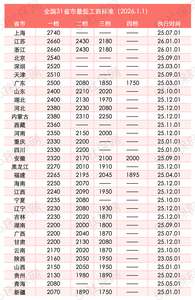 2026年1月1日起,多地已按照最低工資新標(biāo)準(zhǔn)執(zhí)行。趕緊一起來看看~ 01、全國31省最新工資標(biāo)準(zhǔn) 截止2026年1月1日,全國31省最低工資如下表: